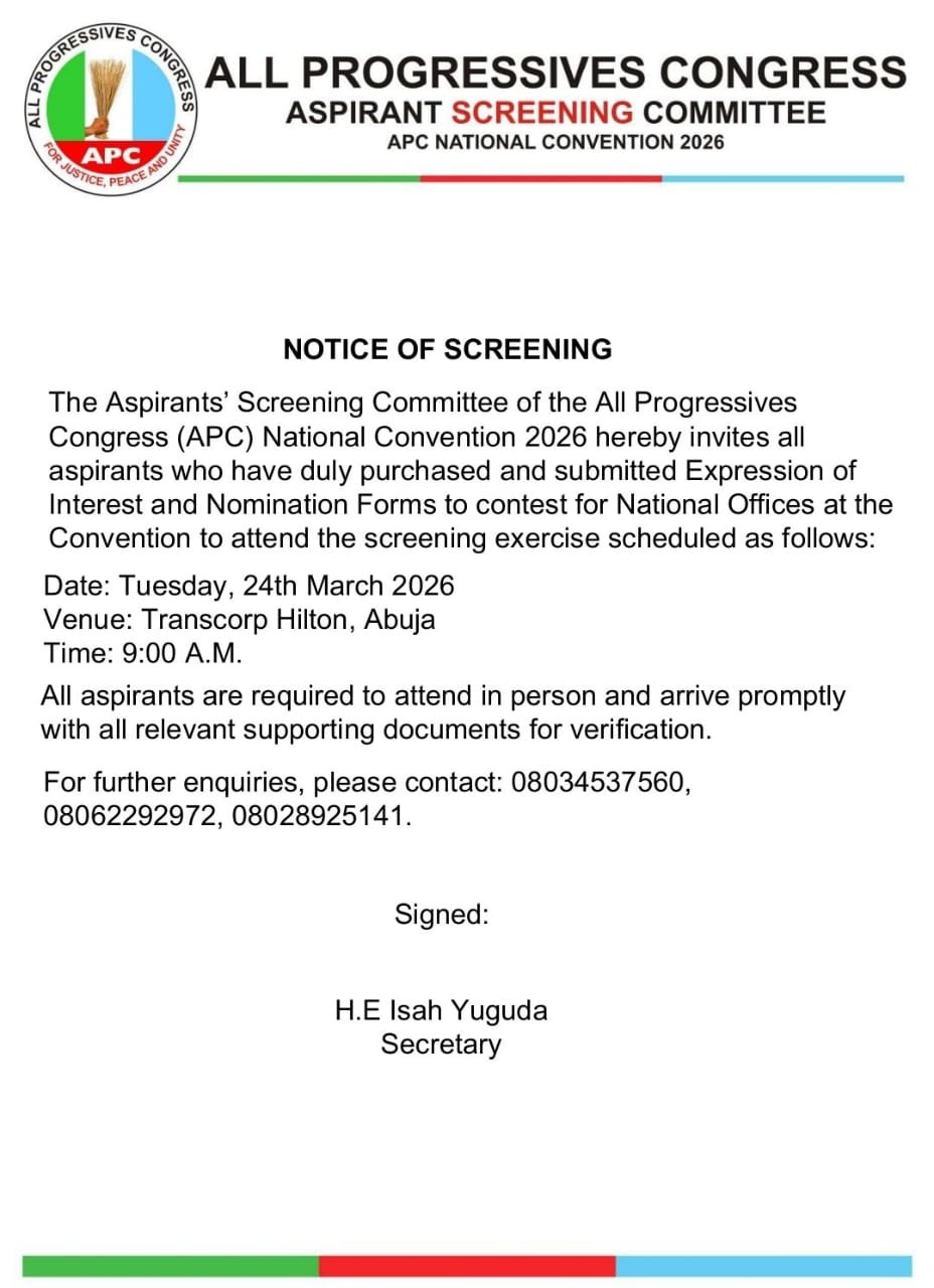 The All Progressives Congress(APC) has announced plans to screen aspirants seeking to contest for national offices at its 2026 national convention.