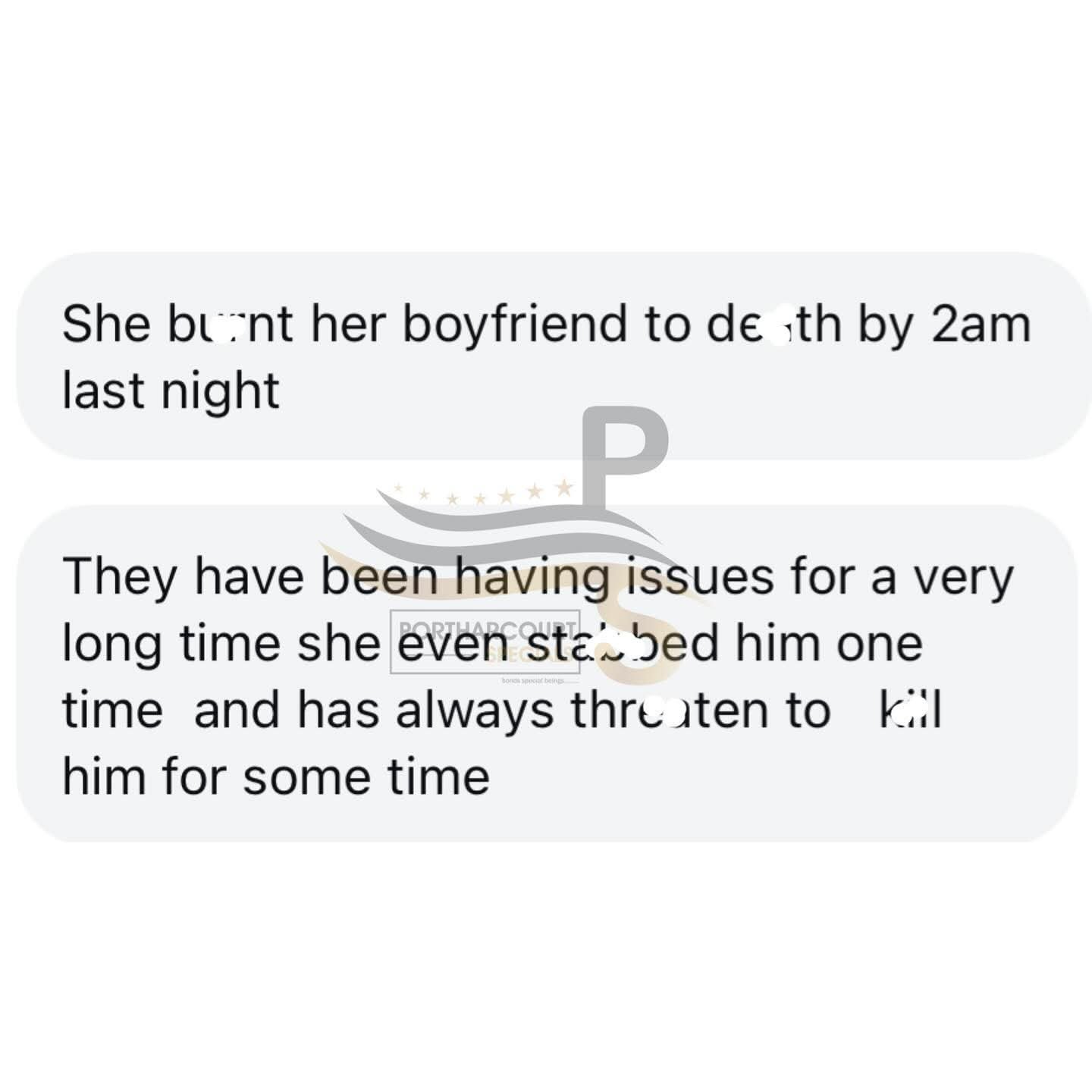 An unidentified young lady in the capital city of Rivers state has reportedly set her boyfriend ablaze. The incident was said to have occurred by 2 a.m. while the victim was asleep in his home in Choba, Port Harcourt.