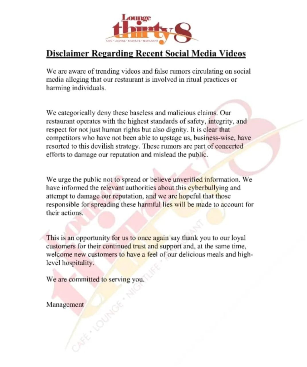 “Our restaurant operates with the highest standards of safety, integrity, and respect for human rights and dignity. It is clear that competitors who have not been able to upstage us business-wise have resorted to this devilish strategy,” the statement read.