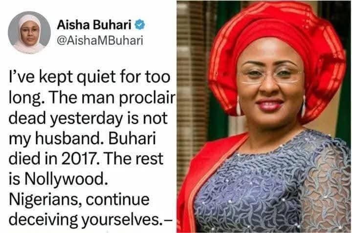 In more recent events, there has been a tweet circulating social media that was tweeted from the alleged handle of the former first lady, Aisha Buhari where she stated that the person who was proclaimed dead yesterday is not her husband and Aisha kept quiet for so long.