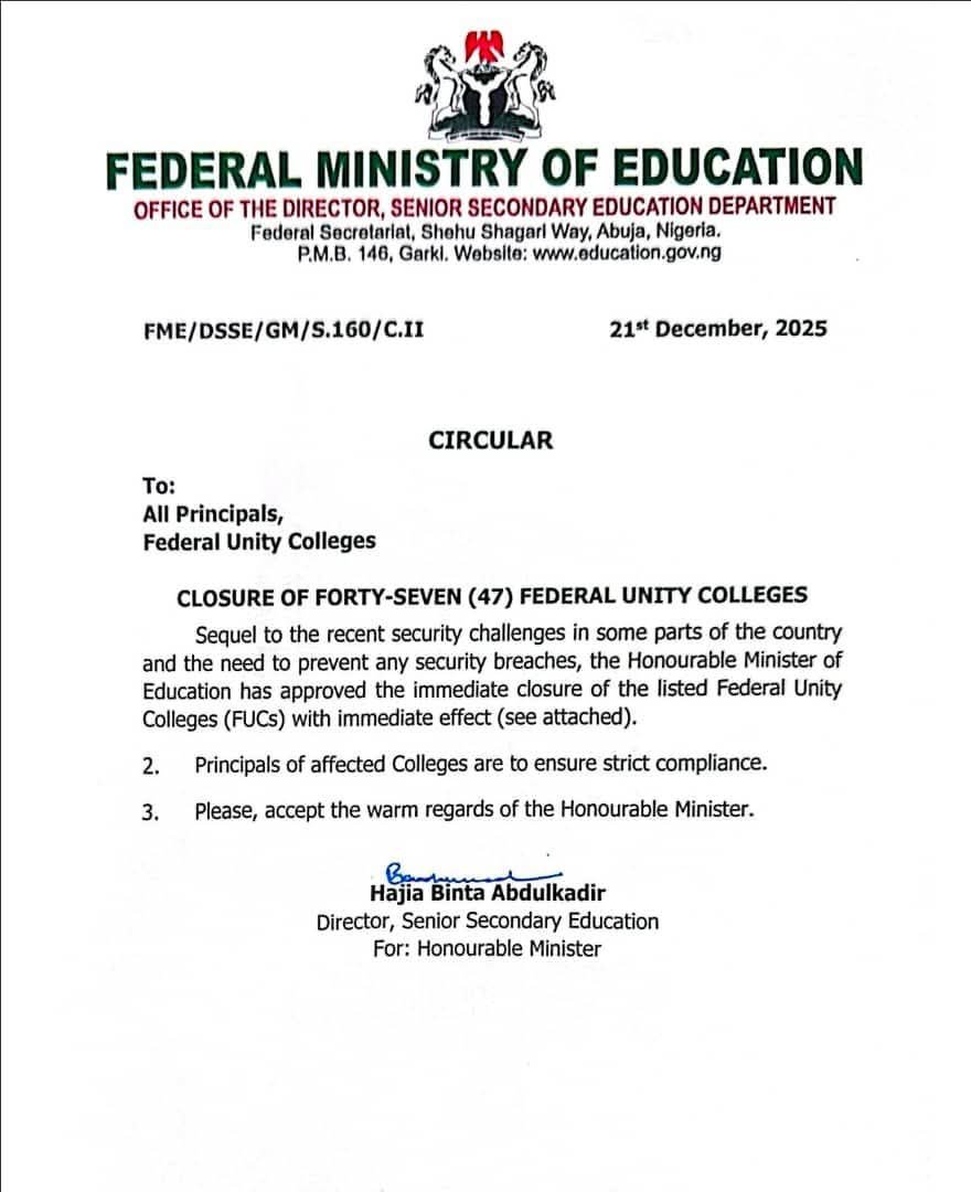 “Sequel to the recent security challenges in some parts of the country and the need to prevent any security breaches, the Honourable Minister of Education has approved the immediate closure of the listed Federal Unity Colleges.