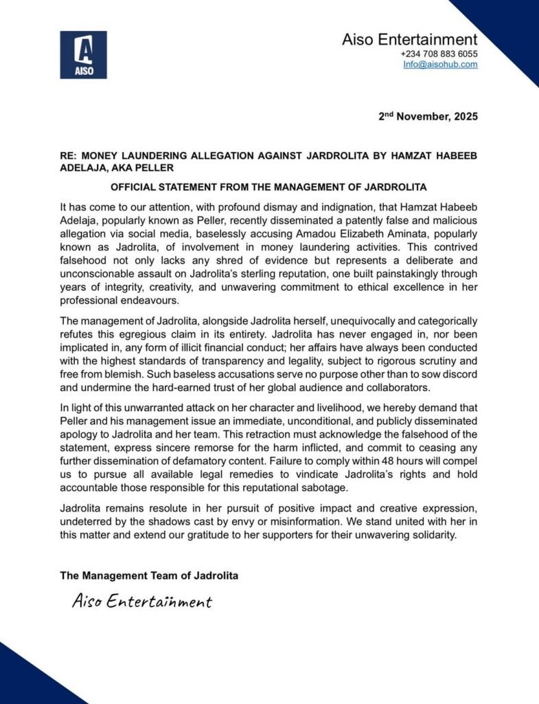 Following accusations of money laundering on social media, the management of content creator Amadou Elizabeth Aminata, also known as Jarvis (Jadrolita), has requested an instant public apology from partner and fellow influencer Hamzat Habeeb Adelaja, also known as Peller.