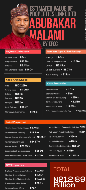 Malami has been linked to properties valued at more than N200 billion. The assets are thought to have been obtained during his tenure as former President Muhammadu Buhari’s attorney general from 2015 to 2023.