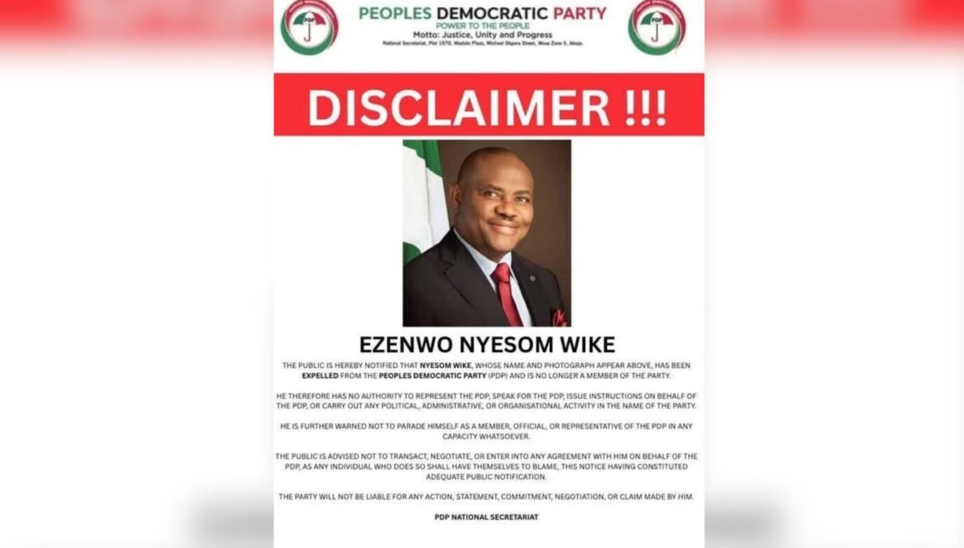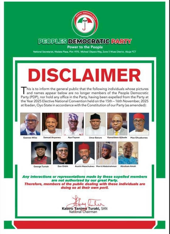 In response, the Wike-aligned group issued a counter-disclaimer listing eighteen lawmakers that it said had been expelled on November 18 by the National Executive Committee (NEC) for transgressions ranging from “gross misconduct” to “anti-party activities.”