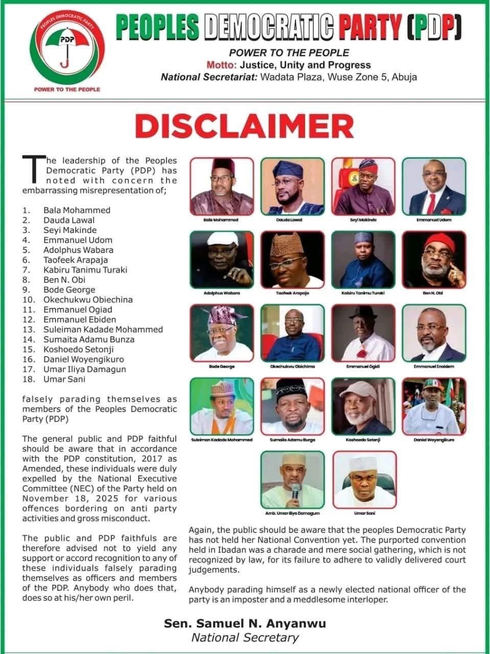 The notice, signed by Samuel Anyanwu, national secretary, listed Bala Mohammed, Dauda Lawal, Seyi Makinde, Emmanuel Udom, Adolphus Wabara, Taofeek Arapaja, Kabiru Tanimu Turaki, Ben Obi, Bode George, Okechukwu Obiechina, Emmanuel Ogidi, Emmanuel Eledan, Suleiman Kadade Mohammed, Sumaila Adamu Bunza, Kosheodo Sotonji, Daniel Woyengikuro, Umar Sani and Umar Bargo.