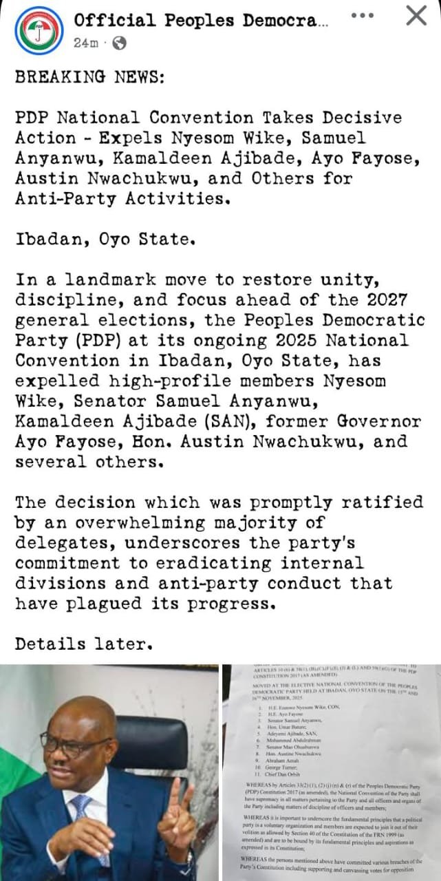 This is according to the official statement released by @OfficialPDPNig across its social media handles, which read, “In a landmark move to restore unity, discipline, and focus ahead of the 2027 general elections, the Peoples Democratic Party (PDP) at its ongoing 2025 National Convention in Ibadan, Oyo State, has expelled high-profile members Nyesom Wike, Senator Samuel Anyanwu, Kamaldeen Ajibade (SAN), former Governor Ayo Fayose, Austin Nwachukwu, and several others.”