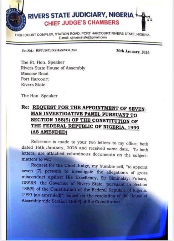 Justice Amadi cited two court orders prohibiting him from receiving, sending, or considering any petitions to constitute such a panel in a letter dated January 20, 2026, to Martins Amaewhule, Speaker of the Rivers State House of Assembly.