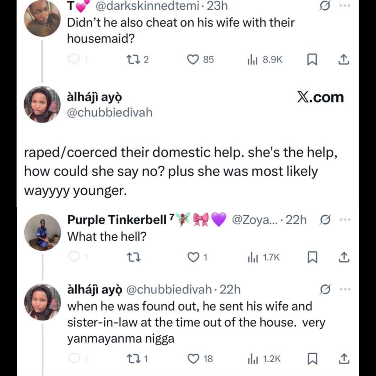 The issue started when @darkskinnedtemi, a different X user, implied that Rudeboy had cheated on his ex-wife by using a housemaid. Ayomide Agoola (@chubbiedivah), another user, then made a more pointed accusation, saying that the singer “raped/coerced their domestic help.” The user further said that the woman was “probably wayyyy younger” and that “the help… how could she say no?”
