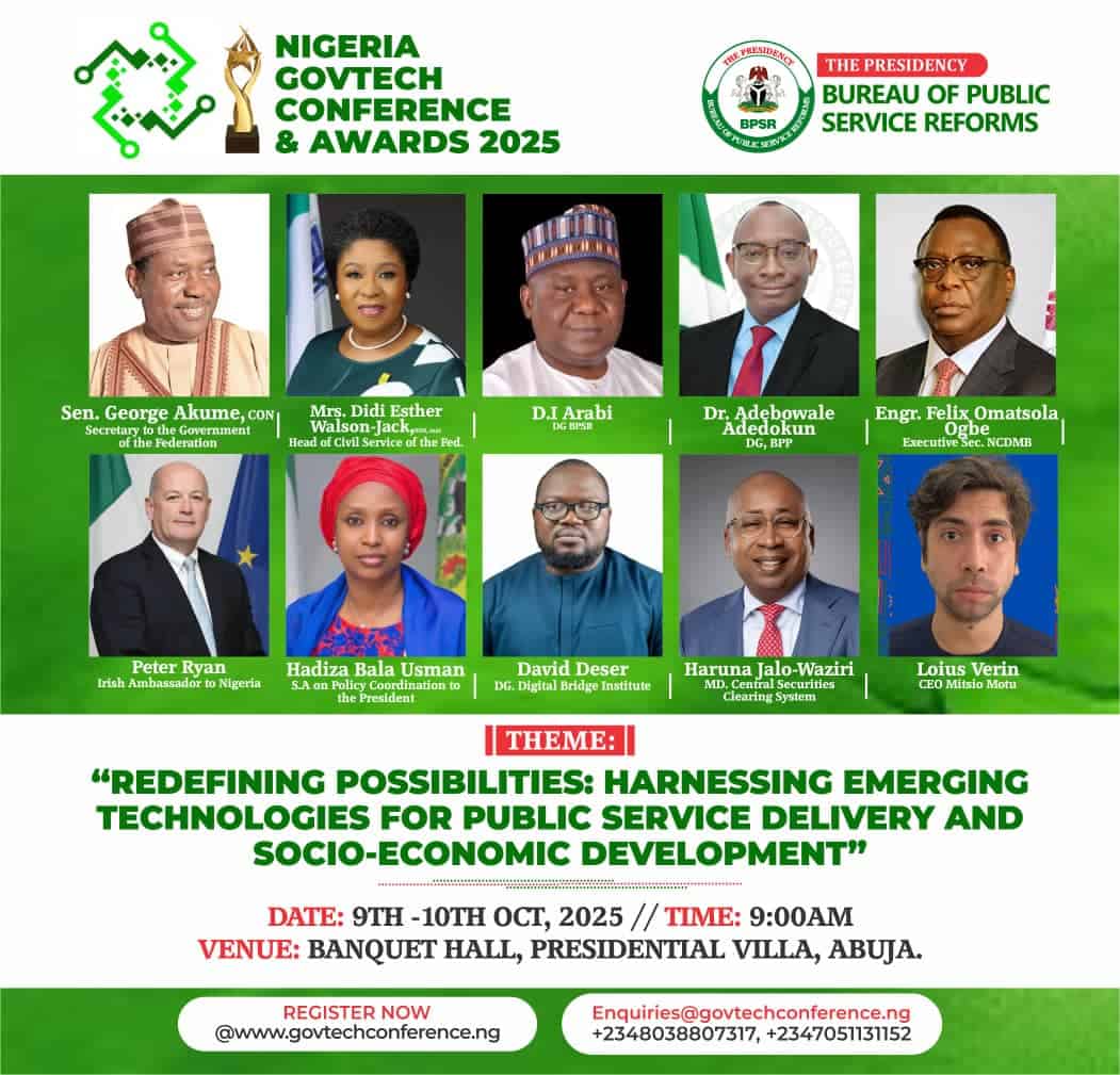 The Bureau of Public Service Reforms (BPSR) has announced plans to host the Nigeria GovTech Conference and Awards 2025 at the Banquet Hall of the Presidential Villa, Abuja, between 9th and 10th October 2025. The highly anticipated two-day event is expected to bring together top government officials, innovators, development partners, and technology experts to explore how emerging technologies can reshape Nigeria’s public sector.