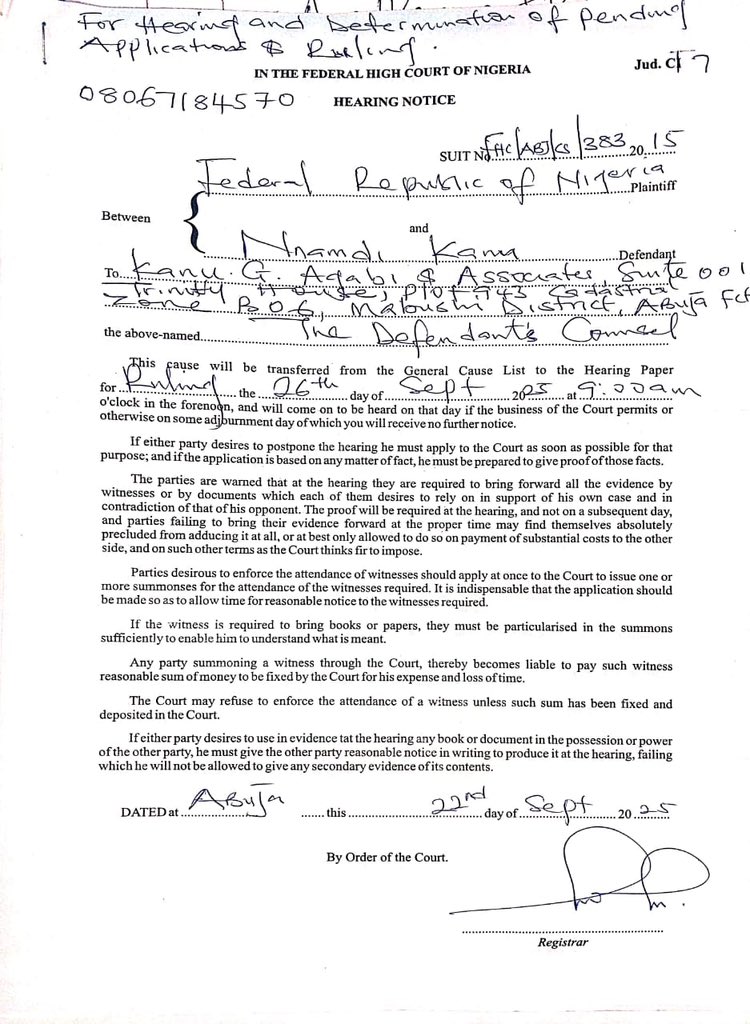 “The scheduled ruling on Mazi Nnamdi Kanu’s no-case submission has been abridged from 10th October 2025 toFriday, 26th September 2025,” he wrote.